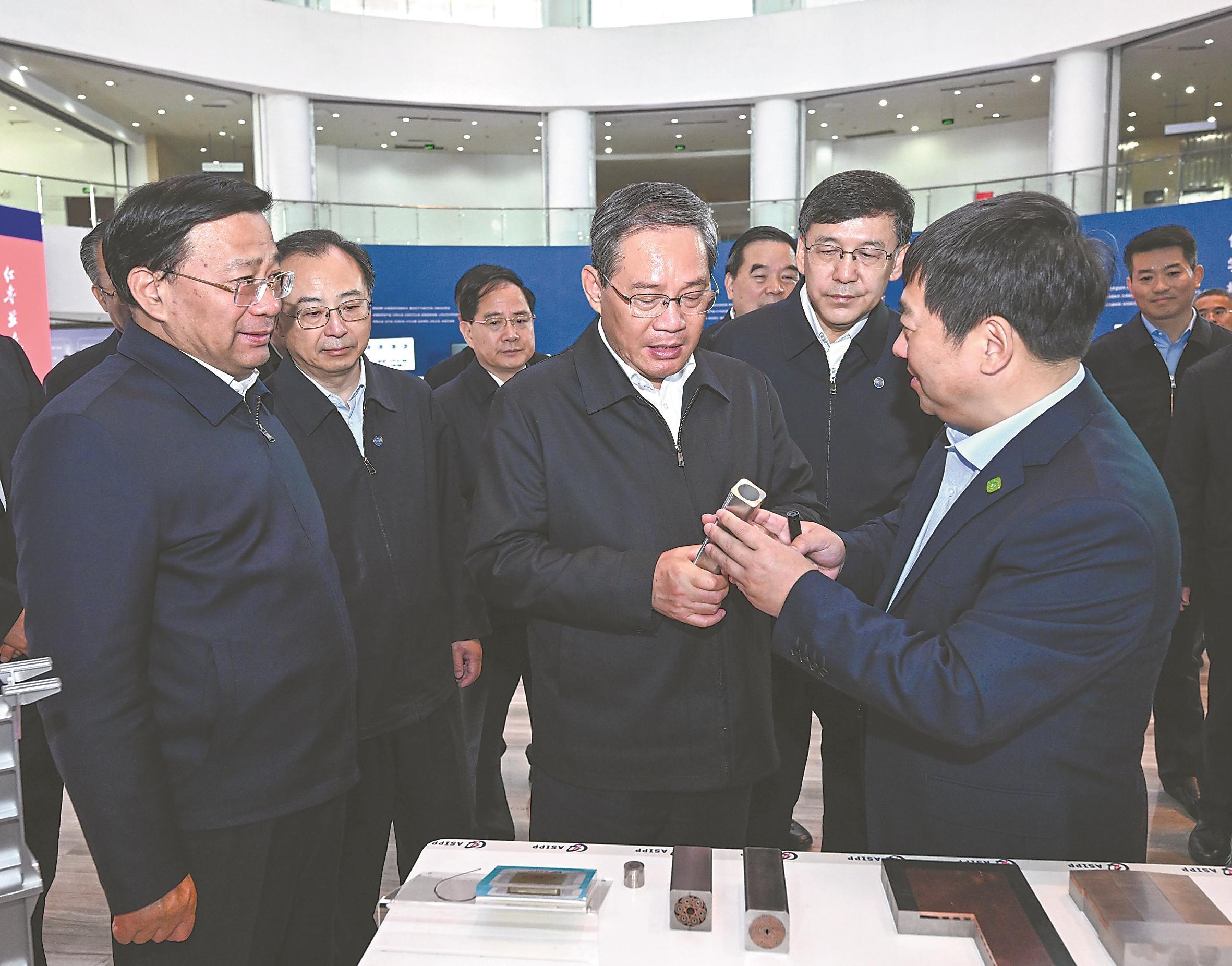 5月10日,中共中央政治局常委、国务院总理李强在安徽调研。这是李强在中国科学技术大学先进技术研究院听取科技创新及成果转化情况汇报,参观科研设备和技术产品展示。新华社记者 饶爱民 摄